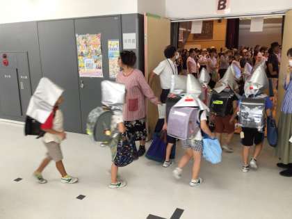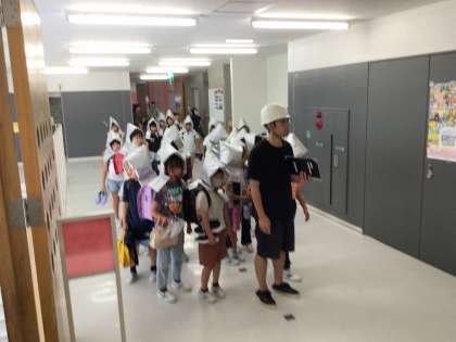 9月の避難訓練は、東海地震の警戒宣言発令にあたり、緊急事態が予想される状況のもとで、安全に児童が帰宅できるように想定した、引き渡し訓練でした。