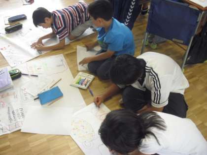 グループで協力し、紙芝居形式にしたり、模造紙に大きく書いたりして4年生に理解しやすいように資料を作ります。