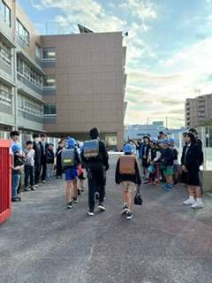 桜木中の生徒が桜小の代表委員と一緒に門に立ち、あいさつしました。