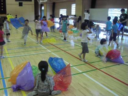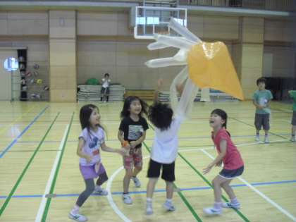 みんなで手でぽんぽんと「たこ」を空中に突き上げ始めると本当に「たこ」が海の中をふわふわと気持ちよく浮き沈みしているようでした。