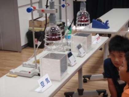 空気と二酸化炭素で満たされたそれぞれの箱を温めて、温度の変化を見る実験では、5分も経つと明らかに二酸化炭素が満たされた箱の方が温度が高くなっていました。