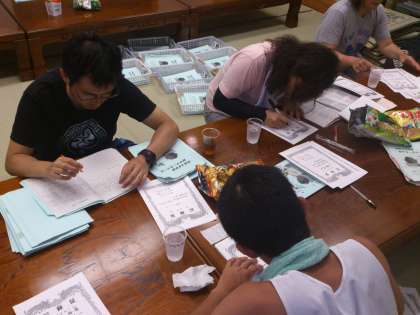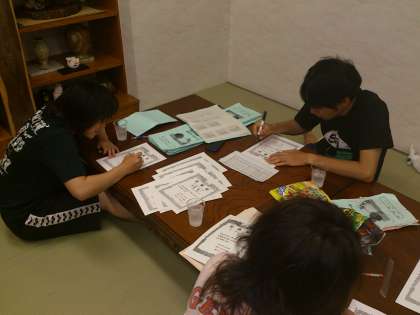 子どもの就寝時間には、水泳指導担当教員が今日の遠泳の賞状を書いています。