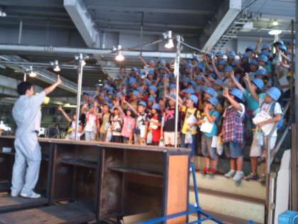 世田谷市場でせりに用いる指の数字の表し方を学び、一路、学校へ。