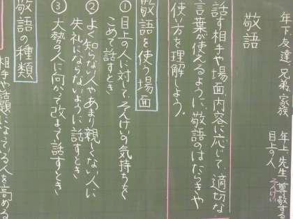 「尊敬語」、「謙譲語」、「丁寧語」などそれぞれの敬語を学び、ワークシートで「常体」で書かれた言葉を「敬語」を用いて書き直す練習をします。