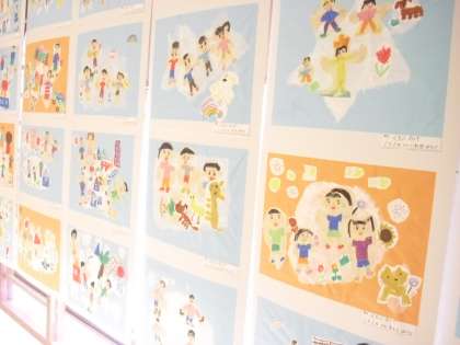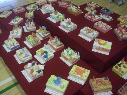 写真の作品は1年生の「雲にのって」と「食べてみたいなこんなケーキ」です。