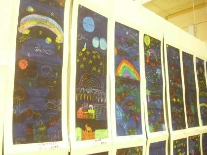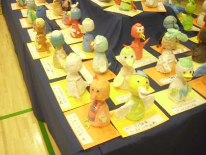 写真は3年生の「スクラッチアート」と「くびふり貯金箱」です。