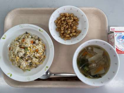 牛乳 チャーハン ワンタンスープ 大豆とじゃこの甘唐揚げ