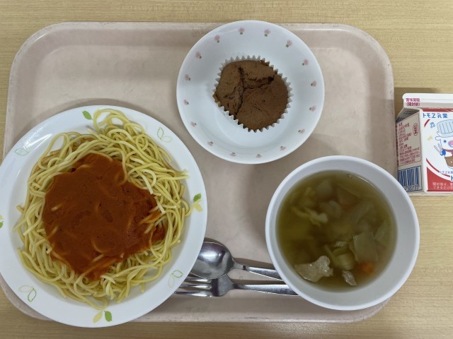 牛乳 スパゲティポモドーロ キャベツのスープ チョコケーキ