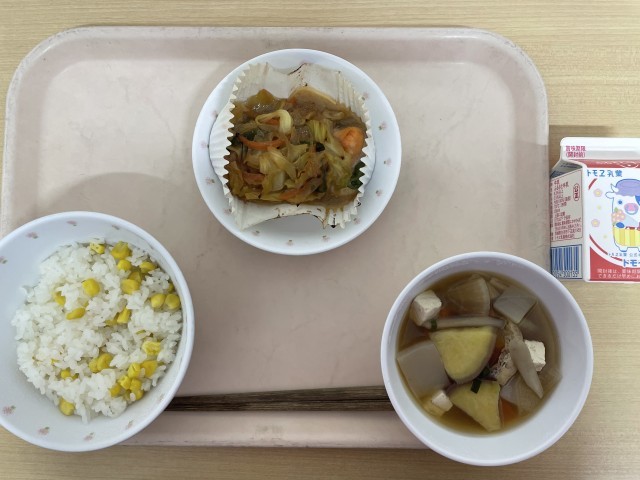 牛乳 とうもろこしごはん 鮭のちゃんちゃん焼き けんちん汁