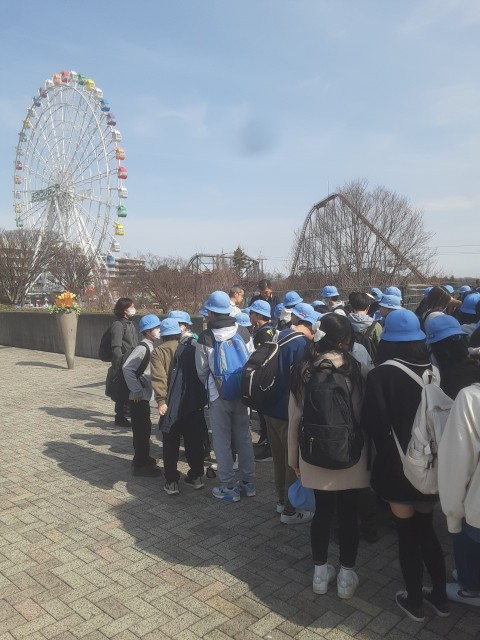 よみうりランドに到着しました。様々な乗り物を目の前にして、子供たちはワクワクしています。これからクラスごとに写真撮影をします。