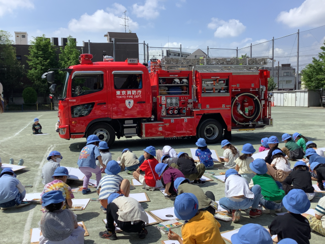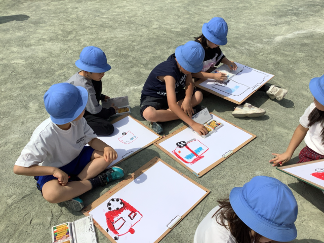 世田谷消防署から消防車が来校しました。実際に間近で消防車を見て、「大きくかく」というめあてで、クレパスを使って大きく迫力ある絵を描くことができました。