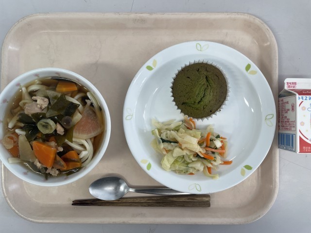牛乳 五目うどん 味噌ドレサラダ 抹茶ケーキ