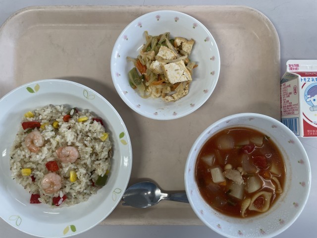 「ナシゴレン」と「ガドガドサラダ」はインドネシア発祥の料理です。「ナシゴレン」は豚ひき肉やコーン、ピーマン、えびなどが入ったチャーハンのような料理です。「ガドガドサラダ」は本当はピーナッツソースをかけて食べるインドネシアの料理ですが、給食では「ごま」を使いました。