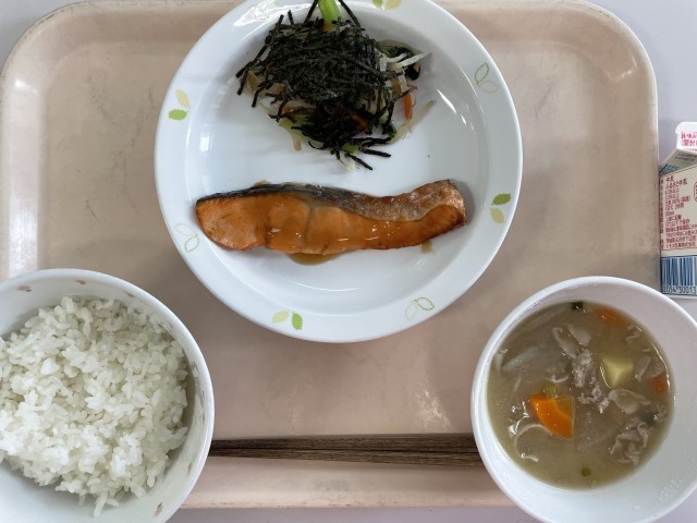 牛乳 有機米ごはん 魚の幽庵焼き 野菜ののり和え 僧兵汁