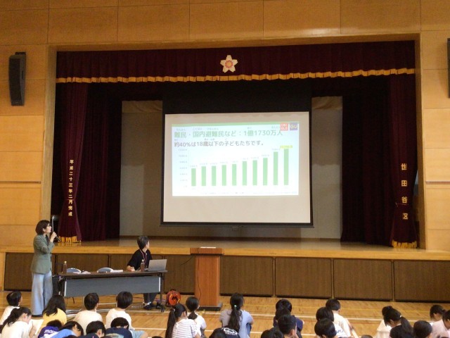 ユニクロの社員さんが来校し、5年生に向けて、「服のチカラ」について授業をしてくださいました。着られなくなった子供服を回収し、服を必要としている難民へ届ける活動をします。