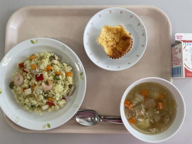 今日は、スペインのバレンシア地方で誕生した「パエリア」です。いかやえびなどの魚介類や野菜が入ったごはんです。本来のパエリアは「サフラン」という調味料がお米の色を黄色にします。給食では、「カレー粉」を使って黄色にしています。