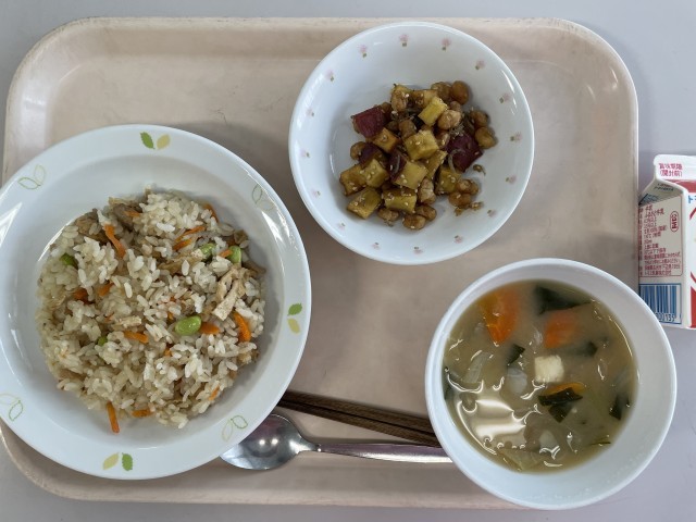 牛乳 子ぎつねご飯 野菜の味噌汁 大豆とさつま芋の甘唐揚げ