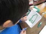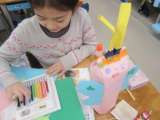 糸で動く仕組みを生かし、おもちゃを作りました。牛乳パックに色画用紙を巻き付けたり...