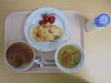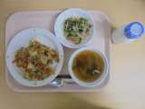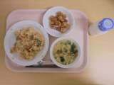 【今日のメニュー】 キムチチャーハン 牛乳 トックスープ 高野とうふのからあげ...