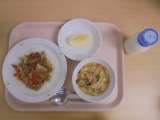 【今日のメニュー】 ホイコーロー丼 牛乳 たまごスープ りんご 【食材の産地...
