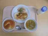 【今日のメニュー】 丸パン 牛乳 かぼちゃのグラタン 大根とツナのサラダ コン...