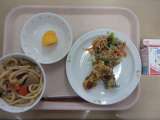 【今日のこんだて】 牛乳 五目うどん ちくわの二色揚げ 野菜のごまあえ 柿 ...