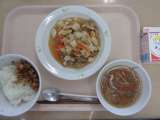 【今日のこんだて】 牛乳 ごはん 大豆とじゃこの甘辛揚げ 豆腐の中華炒め 春雨...