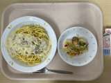 【今日のこんだて】 牛乳 カルボナーラ カラフルサラダ 【食材の産地】 ...