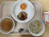 【今日のこんだて】 牛乳 丸パン ハンバーグ コーンチャウダー みかん 【...