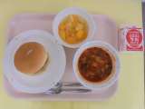 【今日のこんだて】 コロッケバーガー 牛乳 ミネストローネ フルーツポンチ ...