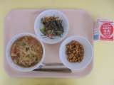 【今日のこんだて】 サンマーメン 牛乳 大豆とじゃこの甘辛あげ 野菜ののり和え...