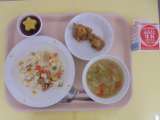 【今日のこんだて】 三色ピラフ 牛乳 ABCスープ フライドチキン ぶどうゼリ...