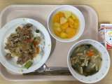 【今日のこんだて】 牛乳 スタミナ丼 凍り豆腐の味噌汁 フルーツポンチ 【...