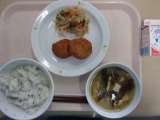 【今日のこんだて】 牛乳 こぎつねごはん 豚汁 青のりポテト 【食材の産地...