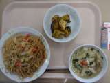 【今日のこんだて】 牛乳 塩焼きそば にらたまスープ 大学芋 【食材の産地...