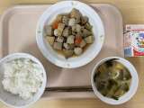 【今日のこんだて】 牛乳 ごはん 鶏肉と里芋の旨煮 油揚げの味噌汁 【食材...