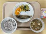 【今日のこんだて】 牛乳 ひつまぶし 野菜の味噌汁 お豆かりんとう 【食材...