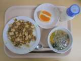 【今日のメニュー】 マーボー豆腐丼 牛乳 春雨スープ くだもの(清見オレンジ)...