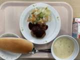 【今日のこんだて】 牛乳 ミルクパン ハンバーグ フレンチサラダ コーンポター...