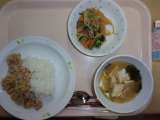 【今日のこんだて】 牛乳 ふわふわそぼろ丼 野菜のごまだれかけ 厚揚げと豆腐の...