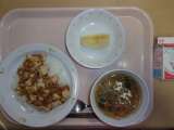 【今日のこんだて】 牛乳 麻婆豆腐丼 春雨スープ りんご 【食材の産地】 ...