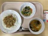【今日のこんだて】 牛乳 ふわふわそぼろ丼 野菜のごまだれかけ 厚揚げと玉ねぎ...