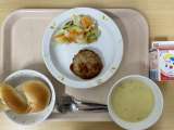 【今日のこんだて】 牛乳 ミルクパン ハンバーグ フレンチサラダ コーンポター...