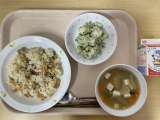 【今日のこんだて】 牛乳 かやくごはん 魚の竜田揚げ かきたま汁 【食材の...