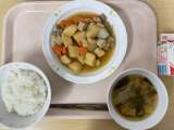 【今日のこんだて】 牛乳 ごはん 肉じゃが旨煮 なめこの味噌汁 【食材の産...