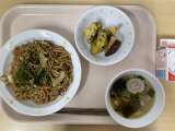【今日のこんだて】 牛乳 ソース焼きそば 中華スープ 大学芋 【食材の産地...