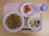 【今日のメニュー】 ソース焼きそば 牛乳 卵スープ いかのチリソース 【食材...