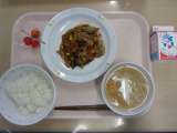 【今日のこんだて】 牛乳 ハヤシライス 野菜スープ りんご 【食材の産地】...