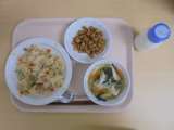 【今日のメニュー】 チャーハン 牛乳 ワンタンスープ 大豆とじゃこの甘辛揚げ ...
