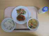 【今日のメニュー】 わかめごはん 牛乳 ゼリーフライ 野菜のゆかりかけ 吉野汁...
